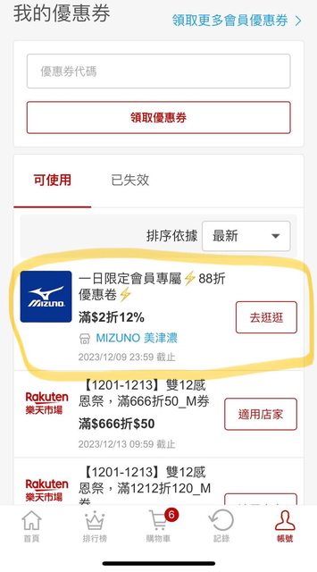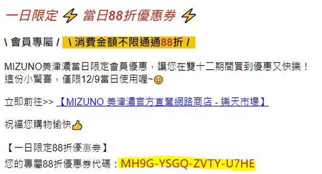 剛開信箱時發現美津濃的活動信,裡面藏了12/09一日限定88折券