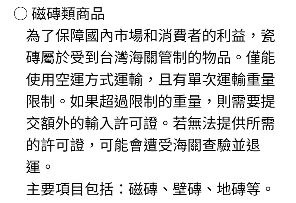 → Ron51320: 磁磚沒禁運嗎? 180.217.11.109 12/22 20:51