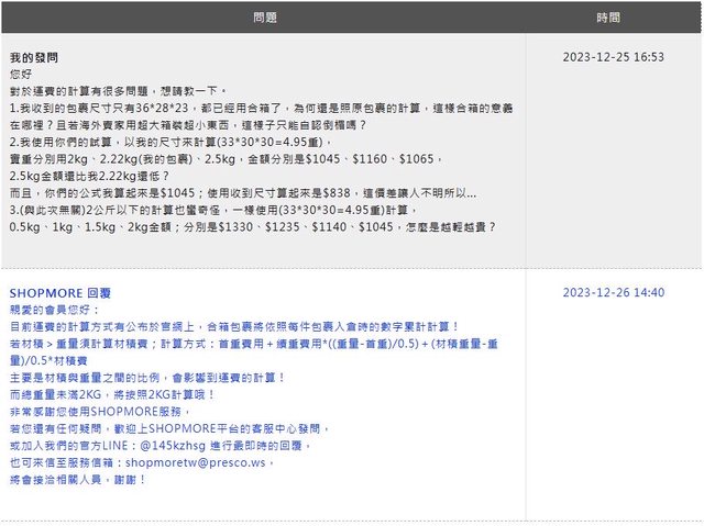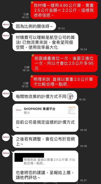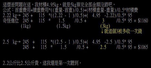 (謝謝一樓的簡單說法!爭議在重量扣2.5kg,但材積卻扣2.22kg,導致被多收一次材積錢)