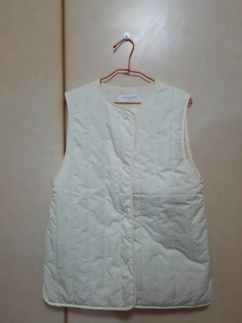 米白色的衍縫背心,兩側都有口袋&金屬壓扣。看日本街頭穿搭一直被燒到這類型的背心,