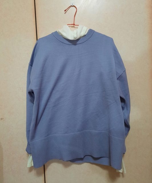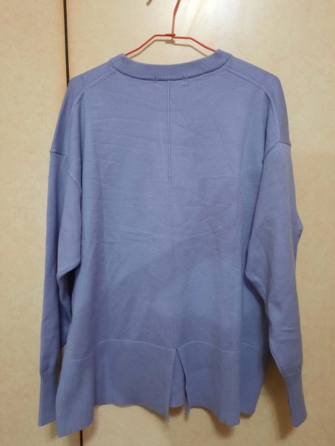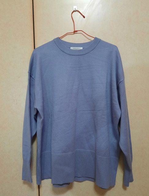 藍紫色的薄圓領針織衫。開福袋前希望收到米白色系的衣服,但也又會很矛盾地覺得全部淺