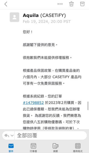 → emily79110: 優惠 客服給你這優惠超沒誠意 58.114.188.54 02/26 05:03