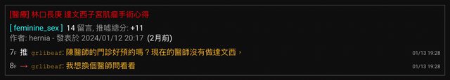 → mista1130: 麼剛好都得了子宮肌瘤都去看了某醫師 27.53.120.164 03/22 11:42