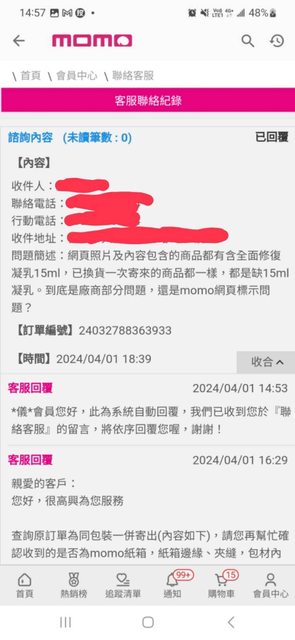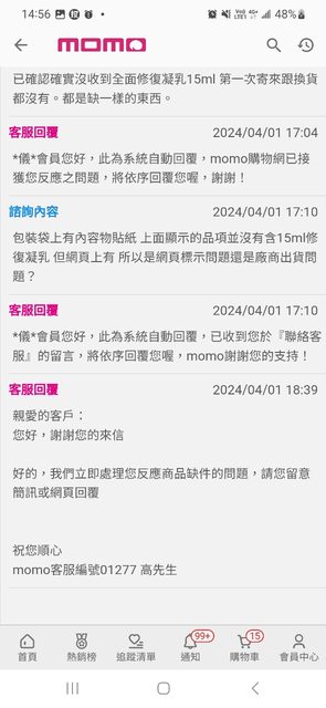 題外話:我4/1當天也有聯絡理膚的line客服,請他們協助處理,因momo客服無法給我一個