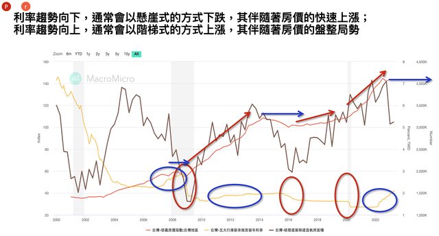 利率向下會導致房價上升;但利率向上並不會導致房價下跌(利率要上升到對於月還款現金