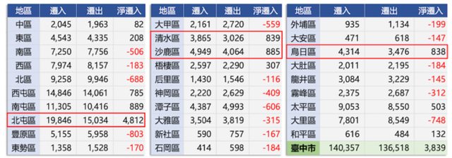 值得關注的是,海線地區的清水、沙鹿區,淨遷入也分別超過800人。