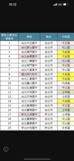 PS: 真的強校 只會講建中北一女上幾個 ,其他都是廢話 另外還有裕德 (國小到高中的一條龍 私立學校),這間學校有多熱門 只要看下面這個你 就能體會 https://i.imgur.com/YJ04Leh.jpg