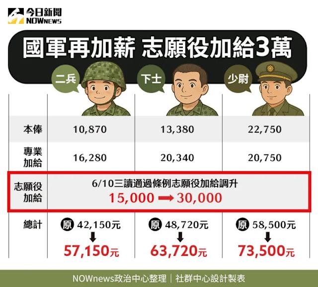 制,等於今年4月國防部最高調薪1.5萬元之外再加碼,志願役官兵每月最高可獲得3萬元