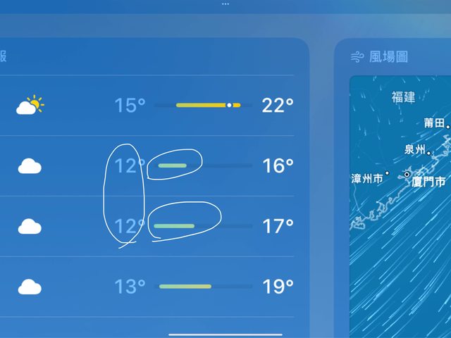 線條的範圍是當天可能的溫度?(可能大範圍預估15-21,但那天可能低溫只到14而已?但