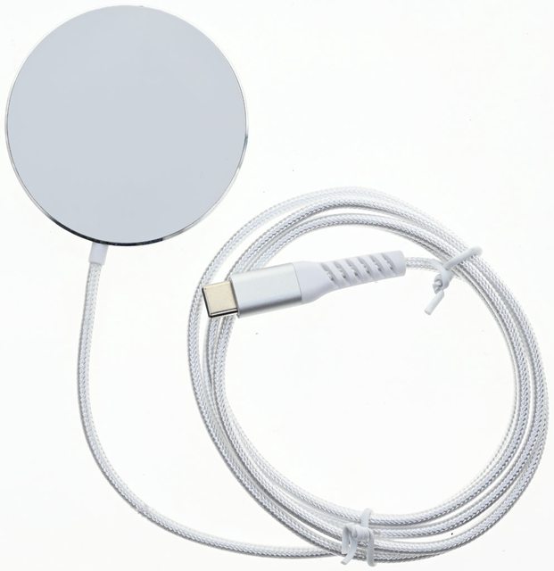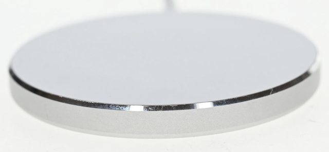 ▼充電盤頂部乳白色圓盤的邊緣區域有磁鐵,可磁吸固定在MagSafe手機或具備磁吸功能