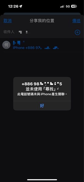但當女友想將位置分享給我時卻出現我的號碼未與哀鳳關聯的提示(如下圖)