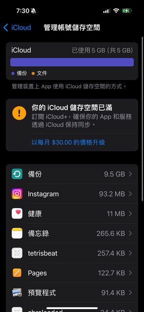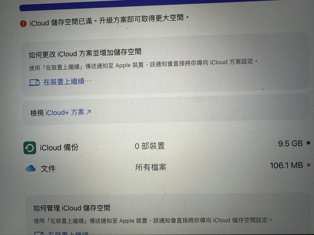 但最後變成9.5G這個容量一直在,而且iCloud 也還是一直顯示容量不足