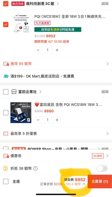 若有10%蝦幣回饋券的話再-95=762