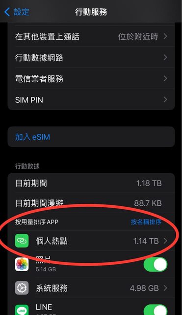 大app我實際分享沒那個高,大概6GB而已,然後個人熱點卻高達1.18TB