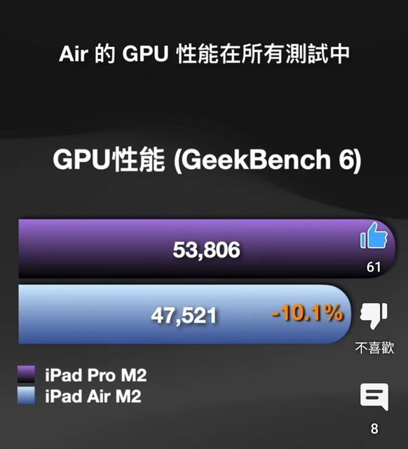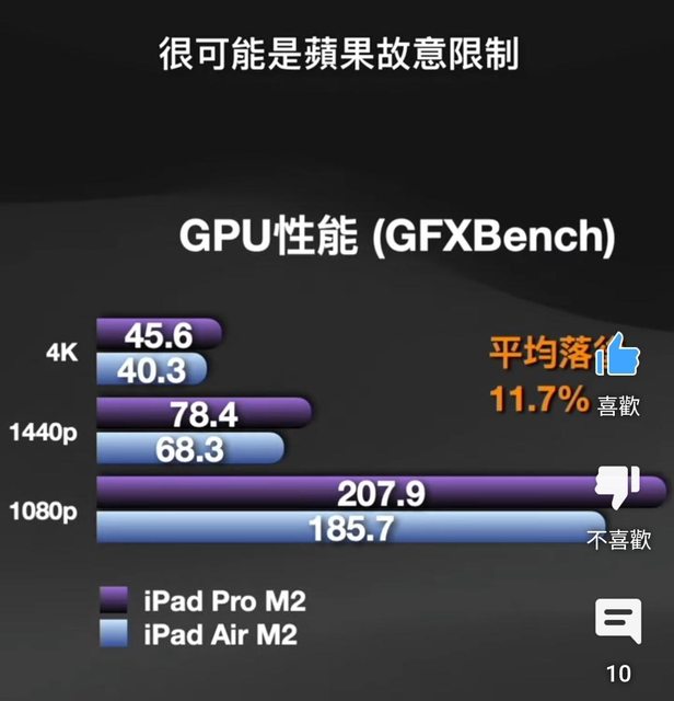 M2性能在 iPad Air 6 也被閹割 (續航還比Pro11"M2差很多…… ref:何同學評測 https://i.imgur.com/liPaEas.jpeg