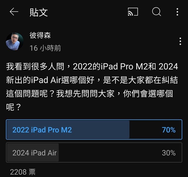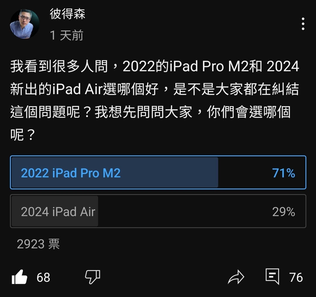 彼得森表示蘋果(庫克)這些操實在太商業了…… 閹割兩顆喇叭跟閃光燈也是很硬要。 總結:目前超過2000多人投票 70%以上選Pro 看來多數人做過功課都知道該買Pro而不是Air (笑 不過現實大概是一堆人不知道Air多爛也沒比較過Pro直接買Air吧 以為Pro是給專業用戶買的 實際上要完整iPad體驗只能買Pro,Pro是終極iPad體驗,Air~無印是極致閹割體驗…… 目前 Apple iPad 產品線除了iPad Pro/Mini ,其他都是 電 子 _ _。 只要新Air繼續大賣我看再過N年iPad Air還是一樣慘。 -- ※ 發信站: 批踢踢實業坊(www.ptt-web.org.tw), 來自: 180.217.7.17 (臺灣) ※ 文章網址: https://www.ptt-web.org.tw/iOS/M.1716967635.A.D35