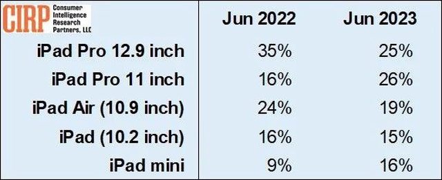 有趣的是 iPad 只有 Pro 11吋 跟 mini 8.3吋 越賣越好 https://9to5mac.com/2023/09/06/most-popular-ipad-in-2023/