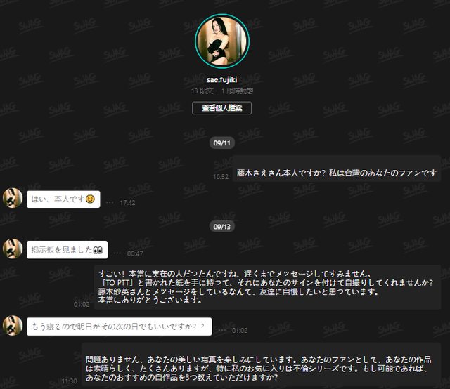 : 這裡補充,如果你打【請問你是本人嗎?我是你台灣的粉絲】