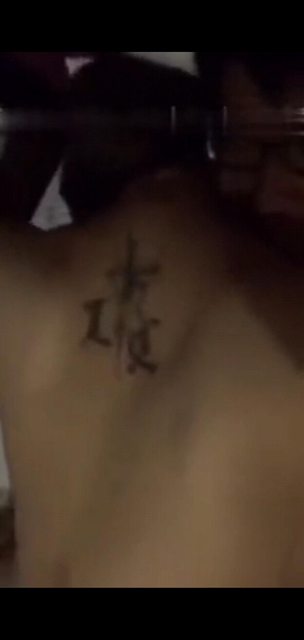 女角背部有類似英文字刺青