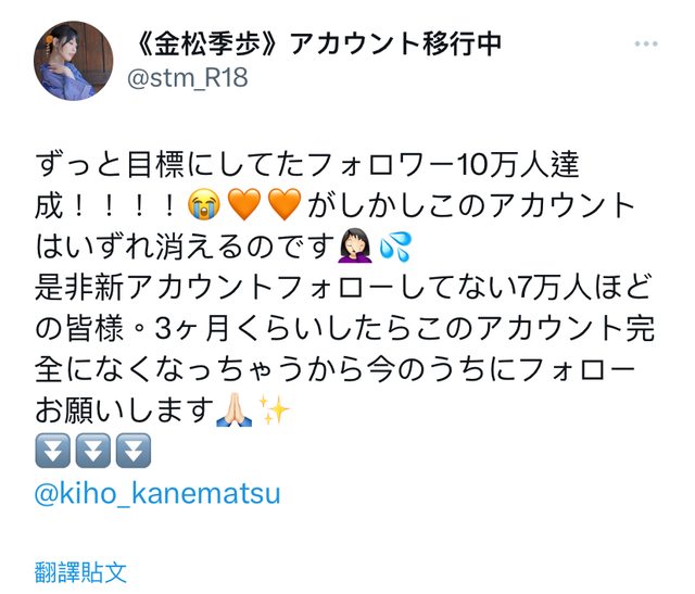 她舊帳號最近也達成十萬追蹤,但帳號之後要刪了