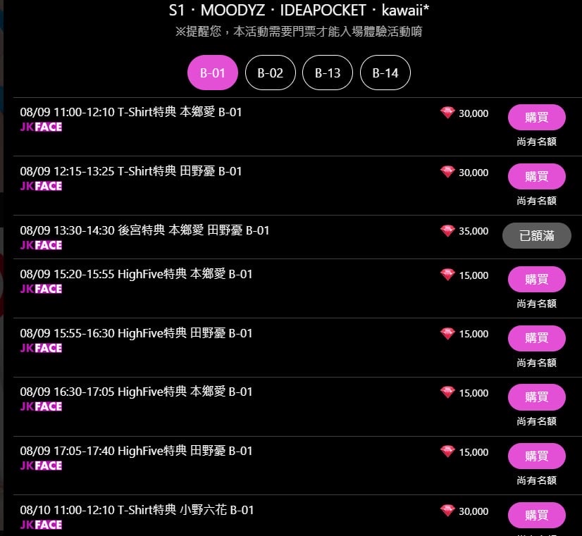 ※特典活動A、B、C、D皆為於JKFACE上以紅鑽直接購買之活動,商品尺寸與款式依照現場