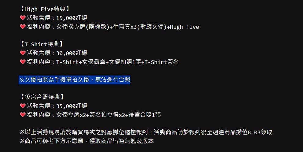 福利內容:女優現場「貼身衣物」+3 Pose個人攝影+握手+合照