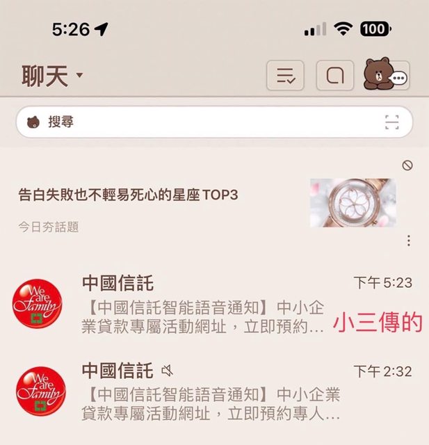 網路上看到的 把小三名字改中國信託 然後傳訊息之前 都先複製中國信託的系統訊息 後面接偷吃的訊息 現在偷吃還有什麼創意方法 有卦? -- ※ 發信站: 批踢踢實業坊(www.ptt-web.org.tw), 來自: 39.14.8.60 (臺灣) ※ 文章網址: https://www.ptt-web.org.tw/Gossiping/M.1693828078.A.048
