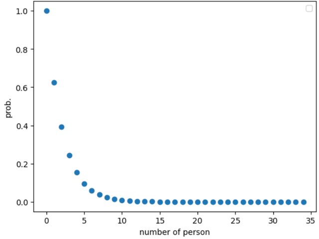 看第一場是完美的機率會是 n=35帶入 ~= 7.49342664114381e-08