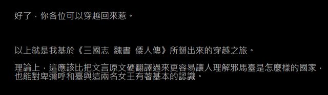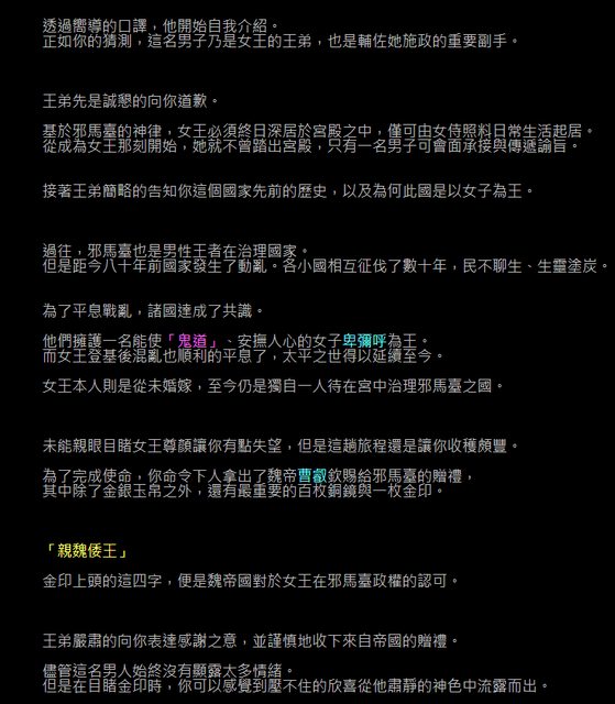 參考我是不怎麼介意,可是你去翻《三國志 魏書三十 倭人傳》, 也就是日本方面通稱為《魏志倭人傳》的內容看看。 你就會發現「完全」沒有使者與卑彌呼王弟見面的紀錄。 甚至連以原文來判斷,金印可能是交給邪馬臺的使臣難生米帶回邪馬臺的, 而不是魏國使者帶去邪馬臺。 甚至講誇張一點,你去把網路和圖書館有關邪馬臺的文章影片翻過一次, 可能也只能找到兩個人這樣寫,一個是我,一個是Cheap。 我幹嘛這樣寫,因為這段就在掰故事啊 == 這篇是FGO的邪馬臺的活動舉辦時寫的, 遊戲故事中給了這名身分不明但顯然實權頗大的王弟頗多的戲份。 所以我在掰故事的時候也特別給了王弟一些戲份。 我甚至還打了預防針,告訴大家以上純屬瞎掰,真正的文言原文不是這樣寫的。 https://i.imgur.com/qb5NvJ3.png