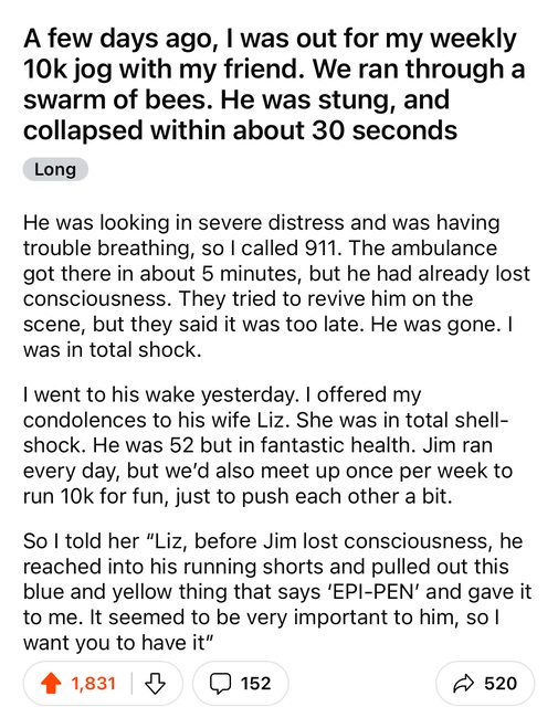 我們跑過一群蜜蜂,他被螫到後三十秒左右就倒下了,