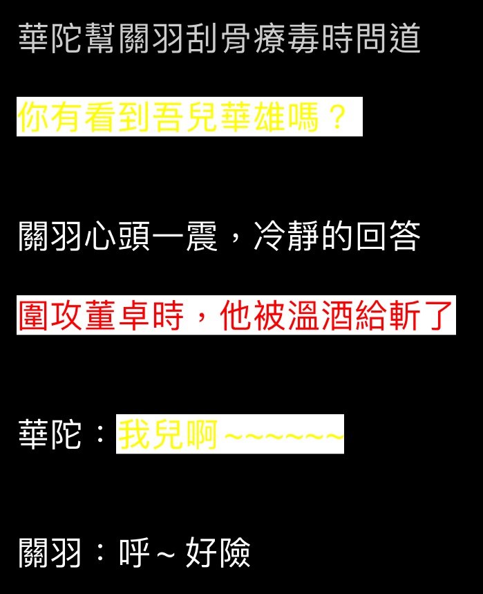 推 if4: 華大夫怎麼不跟關羽說:溫酒是誰?武功強嗎?幫我報仇 ORZ 08/02 01:00