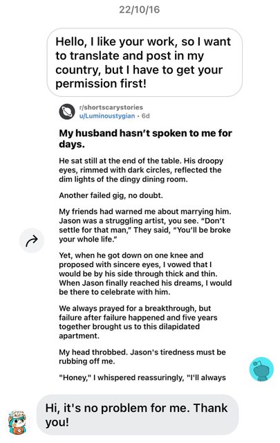 原文網址:https://www.reddit.com/r/shortscarystories/comments/xzmyen/my_husban