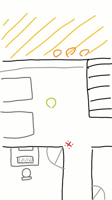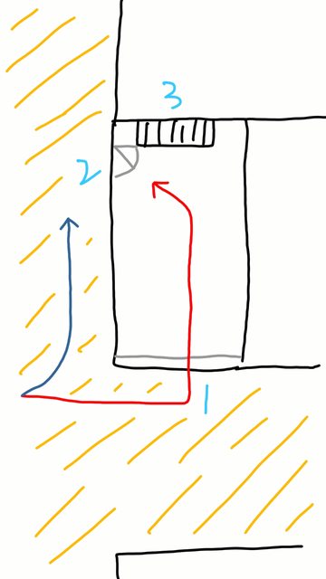 黃色為巷弄路面,進來一點就是開放式的門及樓梯,再進來就是機器區,右下角是廁所,