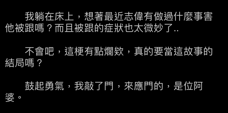 我躺在床上,想著最近志偉有做過什麼事害他被跟嗎?而且被跟的症狀也太微妙了..