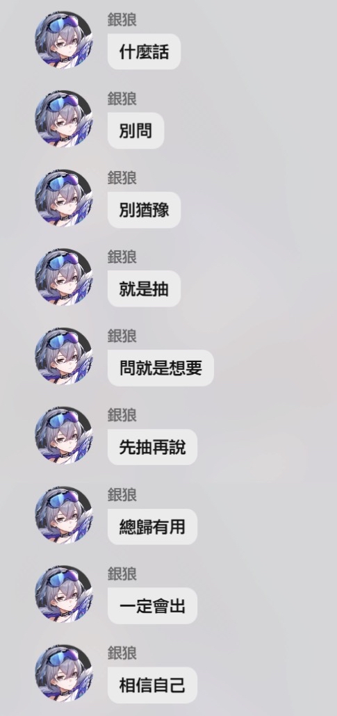 → swind86516: 小保先抽銀狼 歪了就等卡芙卡 沒歪就花點錢補到1+106/27 14:53