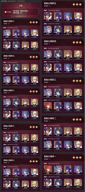 2023/7/24-8/6忘卻戰績圖鎮樓 ———————————————— 1.2版本2023/07/24忘卻之庭全自動滿星: 有出戰的角色詳細資訊
