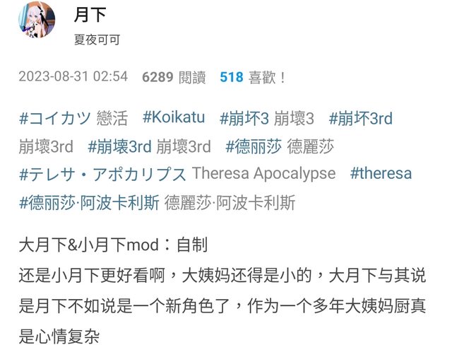 沒有這個角色,我不會認識崩壞3rd,不會來到這個版,不會認識這個公司以及後面他出的