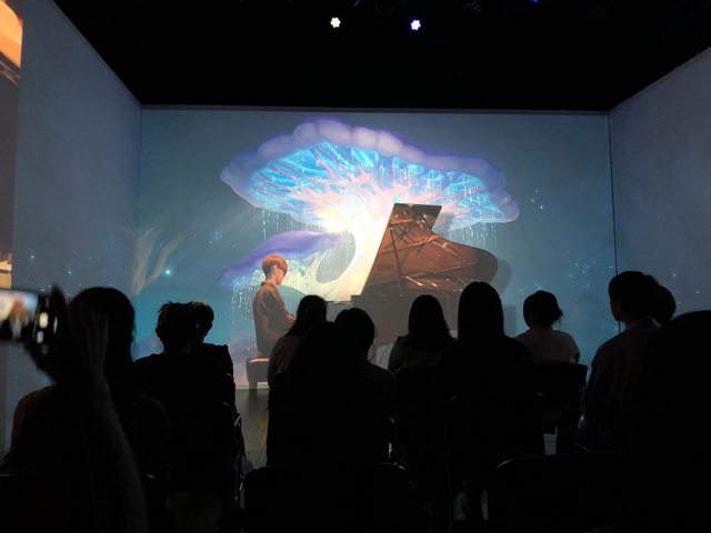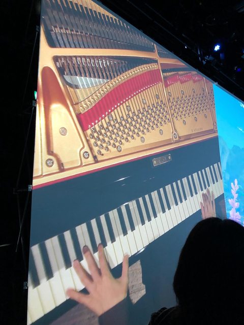 中間則是演奏者和鋼琴(背景是各國風景)
