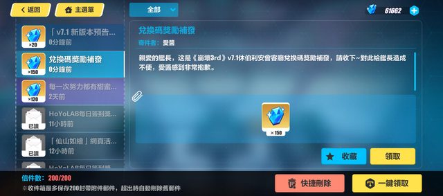 這次少的150水晶在遊戲內信箱
