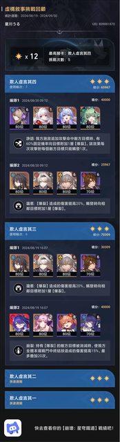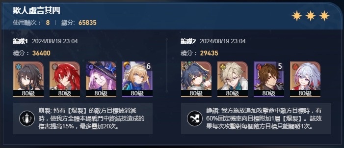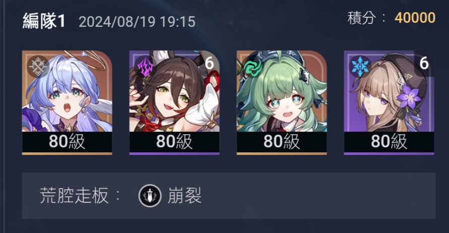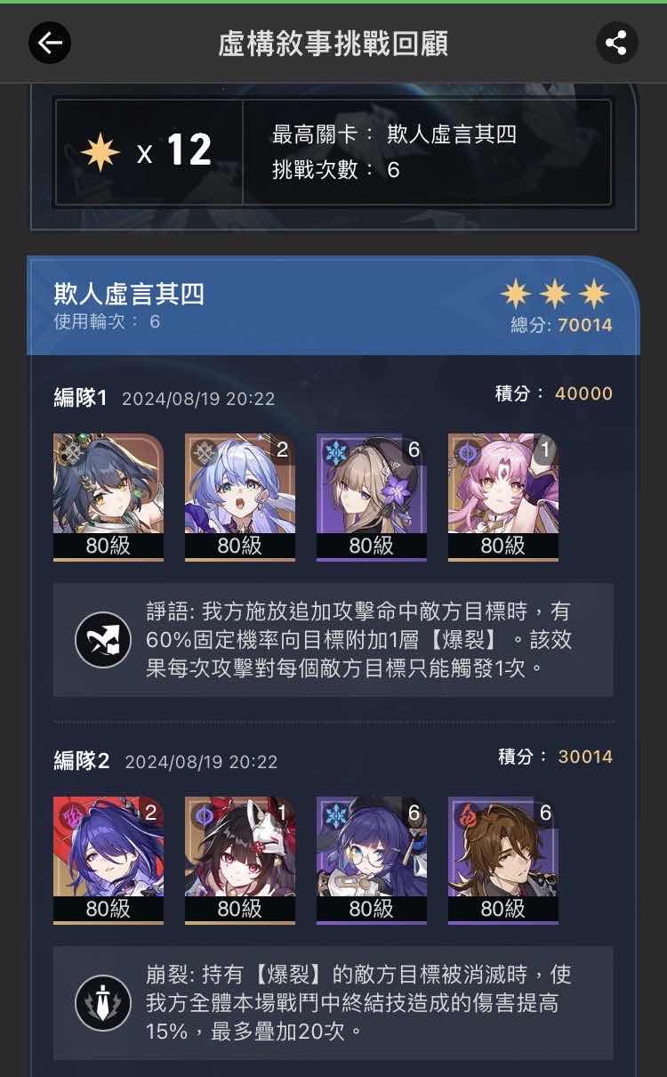 本來還在等人發虛構陣容圖好抄作業的, 後來隨便試沒想到就過了(●—●) 一開始用2+1流螢上和0+1黃泉下。 結果流螢3萬還可以,黃泉明明很適合本期天氣結果auto不到2萬是怎樣??? 後來改成克拉拉單C上路,流螢下路。 結果也不太行,克拉拉只有2萬多分,流螢2.8萬。 這邊就停了想說等版上發文抄作業。 後來看到網路上有人說帶黑塔上路不錯就去試試。 沒想到~( ̄▽ ̄~)~ 居然打滿分了幹!!! 因為性癖沒打中所以一直沒抽卡黑dot和托帕追擊隊的我, 基本都是凹6萬解決的,auto看到滿分還是嚇到了(開auto人就去玩別的了) 下半流螢凹一下還是能3萬,不過黑塔克拉拉太神了就隨便auto過去哈哈。 再次膜拜黑塔克拉拉,虛構的神!! 可是黃泉0+1本期是怎樣? 超級慘的…… 真的要抽到2魂才能玩了嗎? -- ※ 發信站: 批踢踢實業坊(www.ptt-web.org.tw), 來自: 169.150.205.133 (美國) ※ 文章網址: https://www.ptt-web.org.tw/miHoYo/M.1724125376.A.D1A