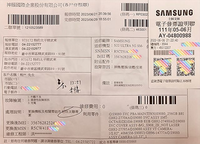 3.因換新機IMEI碼會與原盒不相同,故附上購三星直營買發票、原廠盒裝、維修證明以利