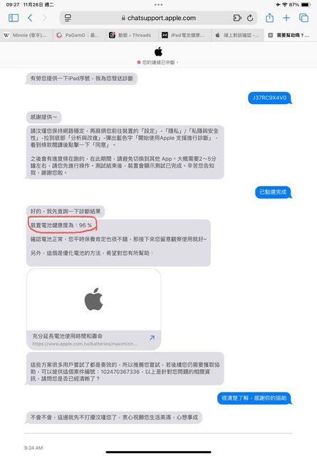 物品狀況:9成新、11/26查詢電池健康度96% ,所有功能都正常,無摔機無維修紀錄,買