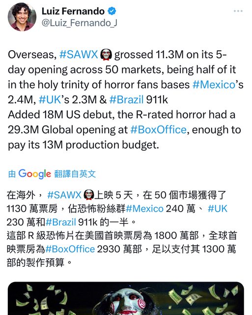 推 nanachi : 奪魂鋸這次全球應該能破億美元10/02 10:25