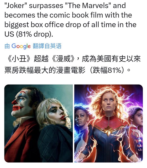 → holyseraph : 結果驚奇隊長2竟然坐不到一年就被小丑2搶走了 10/14 15:34
