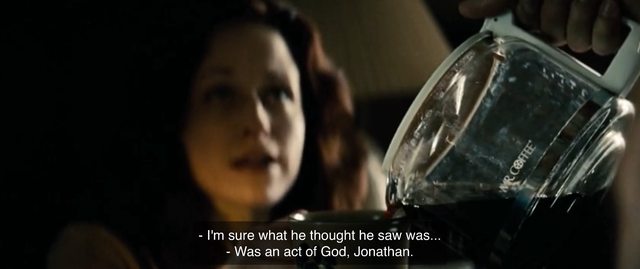 然而霸凌問題先擱一旁 (!)下一場戲馬上有神蹟:(4) 國中克拉克勇救校車不只救佳人、更回頭勇救小胖真「以德報怨」、重點是小胖家長還登門讚嘆 "This was providence"真是屬於少年孩子的高光時刻!只是片中爸媽也只笑笑轉移了話題,卻令克拉克滿腹不平為何「為善不欲人知」須戰戰兢兢?當然在此克拉克有「氪星背景」這尷尬處境非凡人可比,還有 "another father" 與 "sent here for a reason" 非一般孩子可感同身受?在我們家則向來教導「你的才能都是恩賜」但「你的功名都是浮雲」,不用在意旁人眼光也毋須鋒芒畢露,能舉重若輕不著痕跡就是真自信。