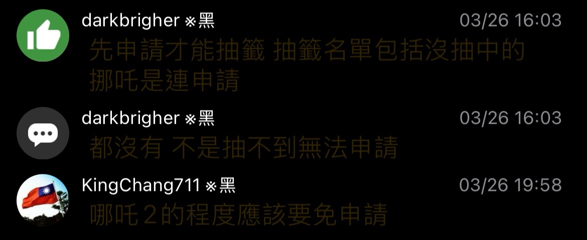 推 darkbrigher : 先申請才能抽籤 抽籤名單包括沒抽中的 挪吒是連申請 03/26 16:03