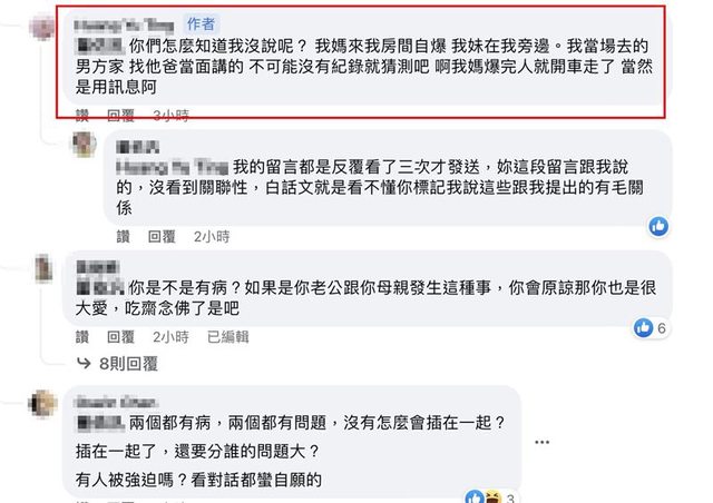 ▲人妻公開與母親的對話,雙方越吵越兇,結果母親反喊自己受害者「妳怎不怪妳老公幹