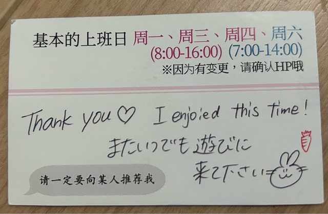 醬簡單的在名片上寫一些字,並遞給我,給我一個擁抱,講了一些日文,應該是希望我下