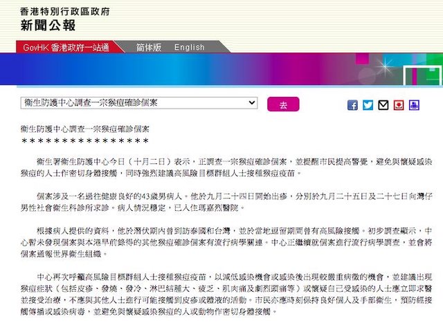 根據香港衛生防護中心昨日發布新聞資訊,正調查一宗猴痘確診個案,個案為一名過往健