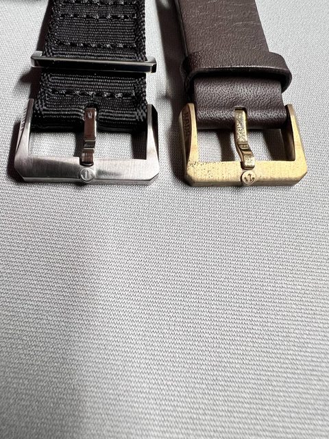 真皮錶帶金屬部份由於是銅的材質,有自然氧化的痕跡。